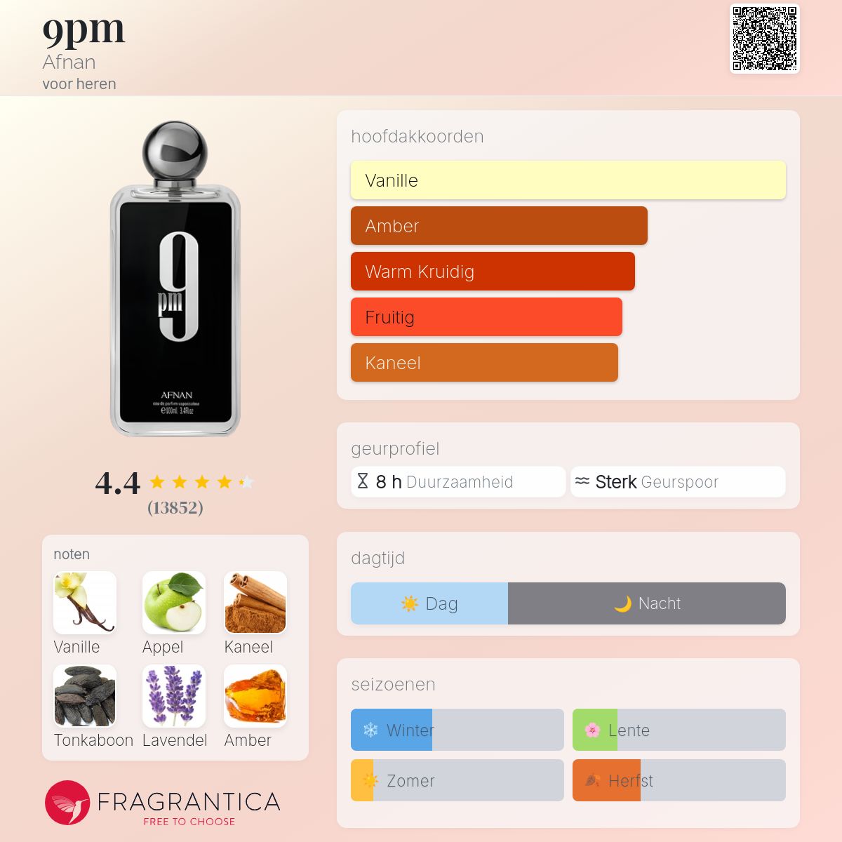 9pm van Afnan is een Oosters Vanille geur voor heren. 9pm werd uitgebracht in 2020. Topnoten zijn Appel, Kaneel, Wilde Lavendel en Bergamot; hartnoten zijn Oranjebloesem en Lelietje-van-dalen; Basisnoten zijn Vanille, Tonkaboon, Amber en Patchouli.